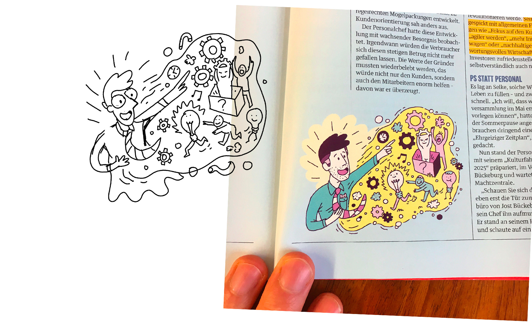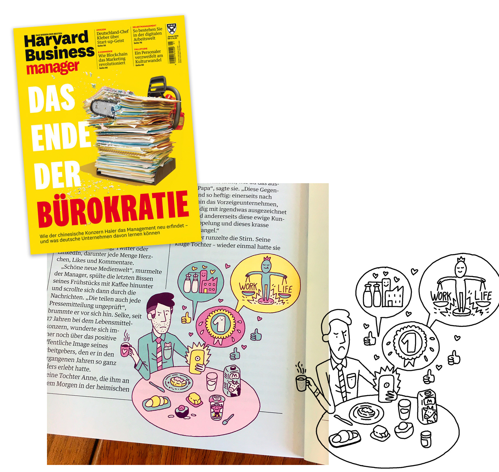 I had the pleasure to do 5 small illustrations for the german Harvard Business Manager Magazine. A fictional story about »Claus Selke« (a nice manager guy) and the »Moltke AG«