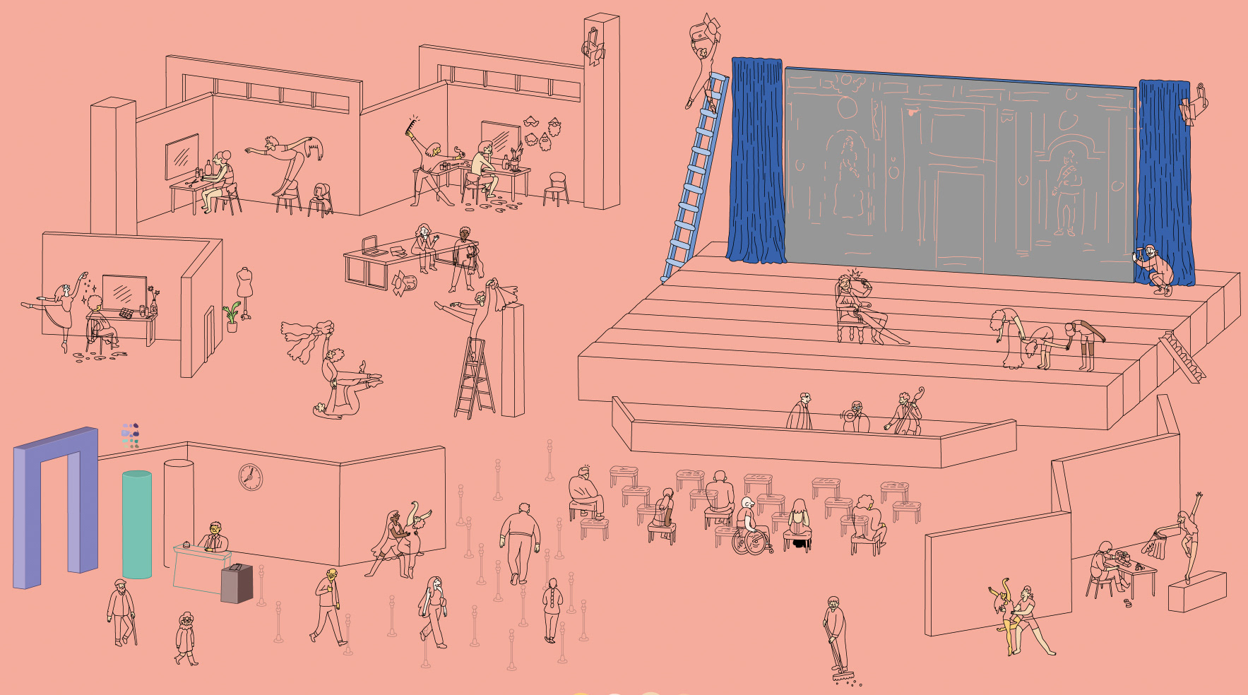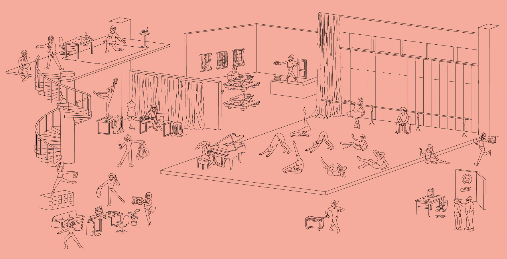I had the honor of illustrating two double pages for the monthly magazine of the Staatstheater Stuttgart. It was about the daily routine at the ballet, before and after the big performance. I tried to bring in a bit of dance and ballet into the picture with the poses of the people i drew. Was great fun!
