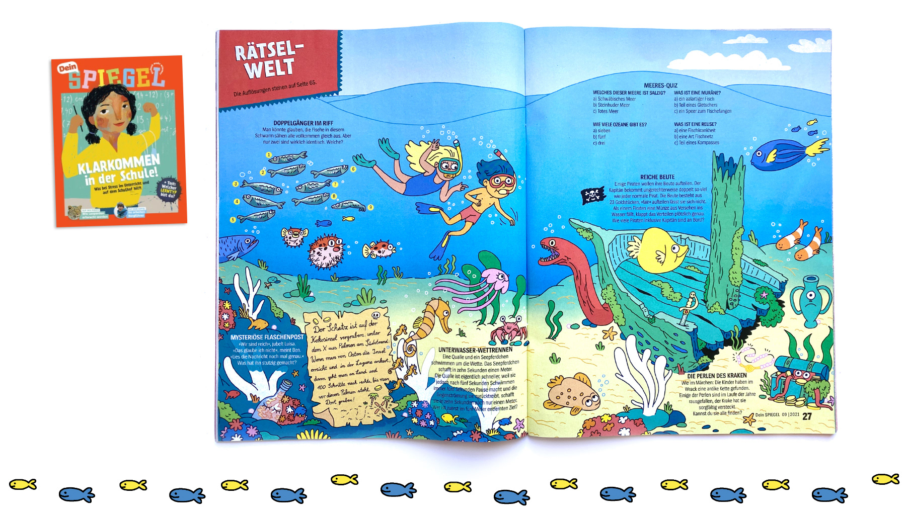 I started working on a puzzle page series for »Dein SPIEGEL« this year. I will be illustrating the children-riddles for the upcoming issues. In the first puzzle we see an underwater scene with two children diving. I had great fun with the different fishes and had to think of my own diving and snorkeling adventures in childhood.