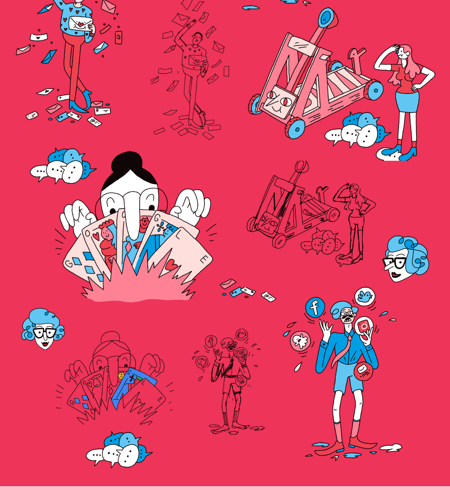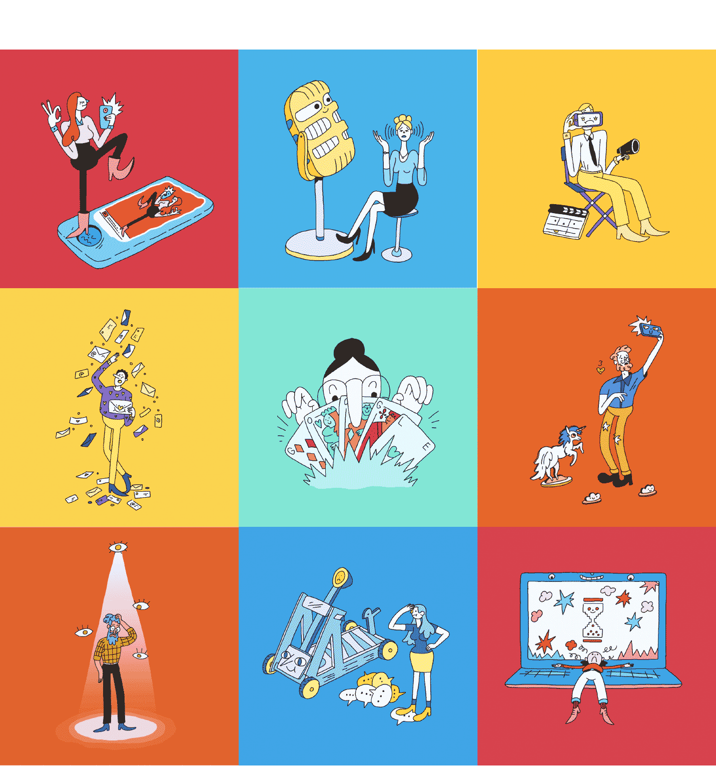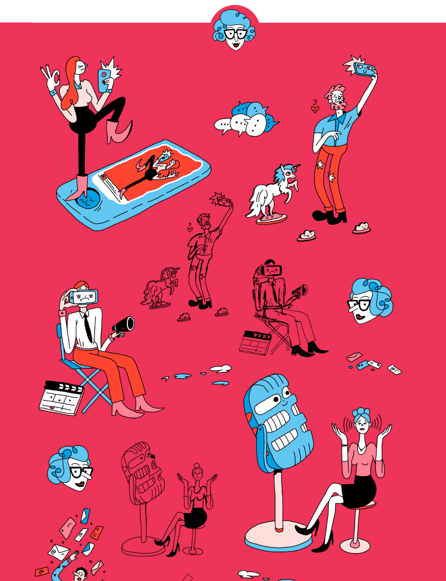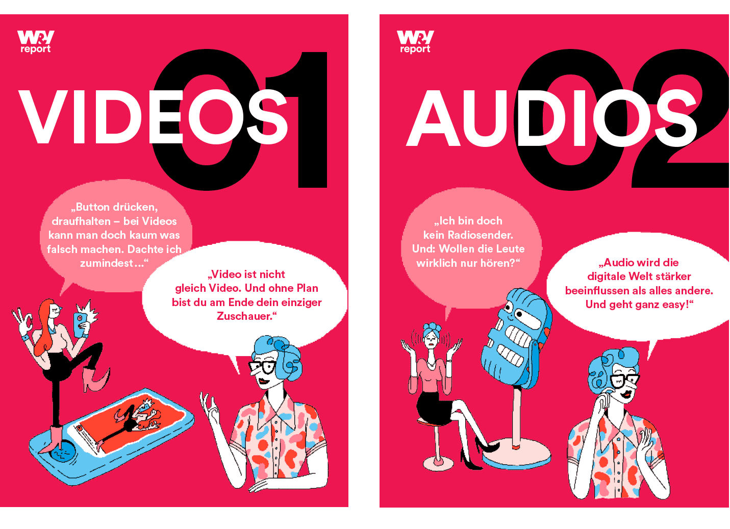 Character designs and some illustrations for a pdf guide on social media. A social media expert explains the most efficient content tools to you. For W&V REPORT.